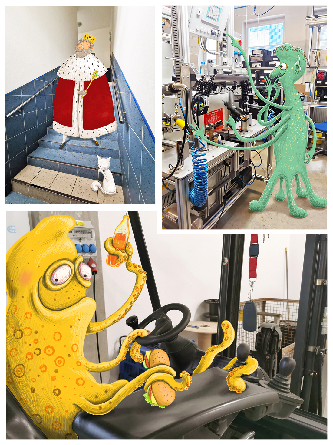 Série fotek z prostorů výrobní firmy, upravených, oživených vtipnými malůvkami. Zdobí dnes stěny firmy a baví zaměstnance i návštěvy.